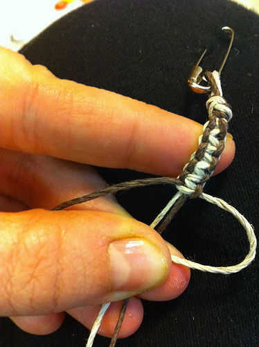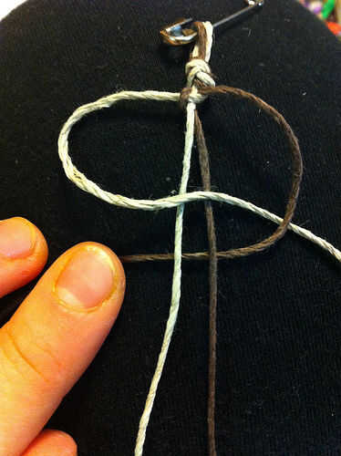 El cable oscuro ahora está a la derecha y el cable de luz está a la izquierda (imagen 5). Elija si desea su macrame plana o torcedura. Elegí la tela plana para esta pulsera. Si usted está haciendo una armadura plana, comience siempre el nudo con el mismo cable, no importa de qué lado está actualmente en (el cable de luz en mi caso). Si usted está haciendo una vuelta de tuerca, siempre comience con cualquier cable está a la derecha.