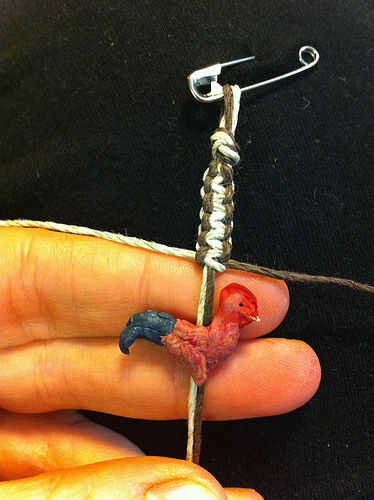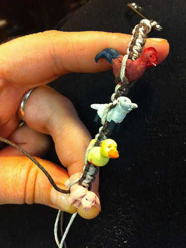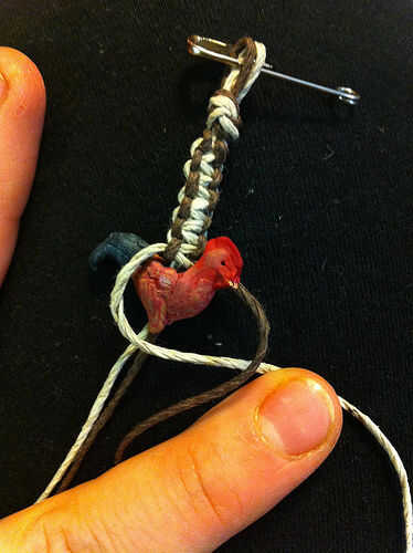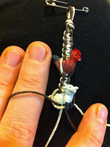 Cuando la pulsera era cuanto quería, yo había atado todos los cuatro extremos en un nudo, goteó algunos pegamento sobre ella para asegurarla y recortar los extremos. El nudo formado una bola que podría deslizarse a través del lazo en el otro extremo para formar un cierre.