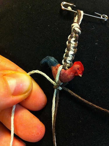 Como antes, empecé con el cable de luz, dejó un bucle de exceso y coloca sobre las dos cuerdas medianas (con el talón anterior) y debajo el cable oscuro (Foto 2). Entonces tomé el cordón oscuro, hecho que fue con el cable de luz, luego coloca debajo de las medianas dos cuerdas (todavía asegurándose que el grano estaba por encima, como en el cuadro 3).