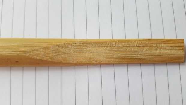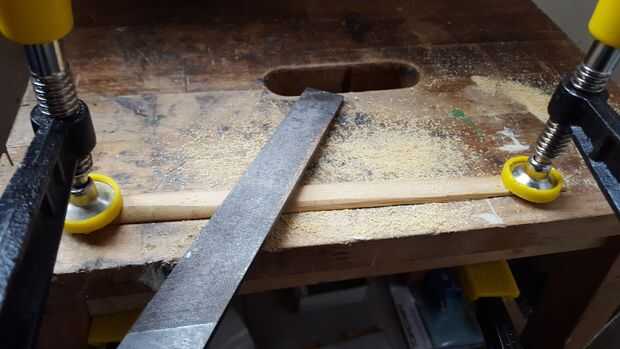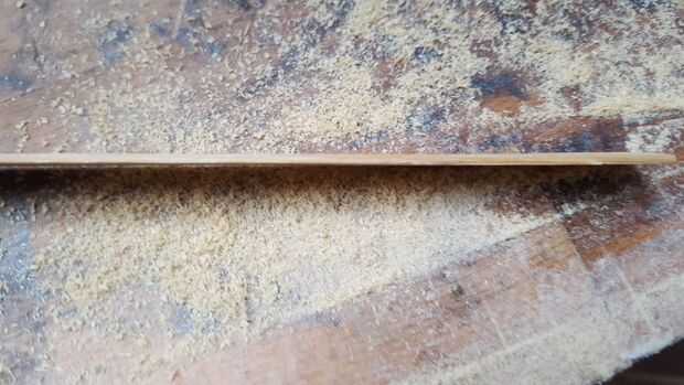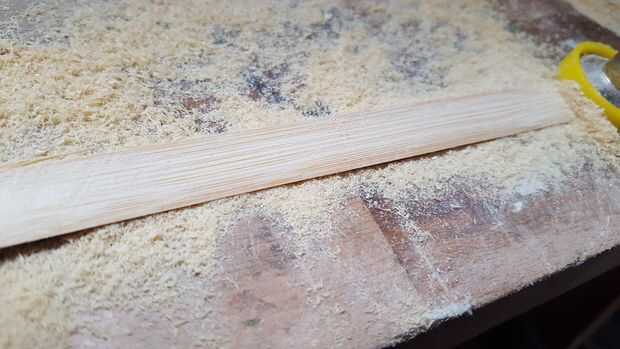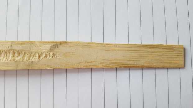 Cuando te queda una tira recta agradable necesita trabajar su camino a través de una serie de medidas para terminar con una tira recta y uniforme. Recuerde que desea que la mayor densidad de fibras pero no necesitan la capa superior de esmalte. Quite esto. Con un cuchillo afilado comenzar cortando las piezas que no necesita. Con la tira de afianzar con abrazadera en una superficie de trabajo quitar todo el material suave con un archivo áspero. Ver fotos. Aviso que la densidad de las fibras también difiere en el color y la capa externa es más sensible. Verificar el espesor para un resultado uniforme. Grueso de la tira debe ser no más de 2 mm. diluyente tiras curva pero también quema más fácil.