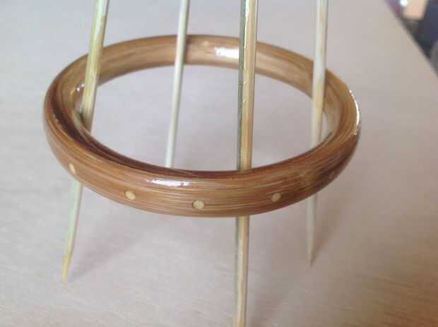 Al aplicar la primera capa de laca de cepillar a menudo la primera capa en la superficie y luego limpiarla él apagado con un pañuelo. Cuando esa capa esté seca sigo la segunda capa. En las fotos ver una sencilla herramienta para sujetar la pulsera mientras se aplica la laca.