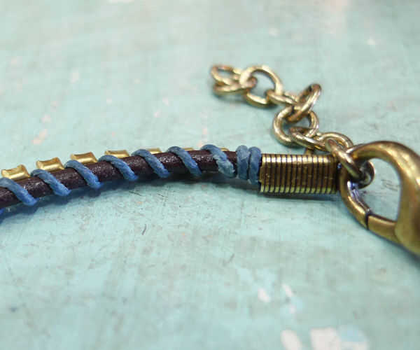 Con cuidado enrolle el cordón lino en un extremo de la piel 2 - 3 veces. Ajuste el cuero en el extremo doblado y prensar el extremo doblado con sus alicates de cadena. Envuelva la ropa como se muestra firmemente alrededor de la piel y la cadena de perla, envolviendo una vez entre cada perla. Continúe envolviendo hasta que se unen el cuero y la cadena de perla para casi toda la longitud de la pulsera, dejando por lo menos.5 cm/25 pulgadas de cuero sin envolver. Tenga cuidado de que la cadena de perla se alinearon a lo largo de un lado de la piel y no en espiral alrededor de la cuerda de cuero. Recorte cualquier cadena perla extra.