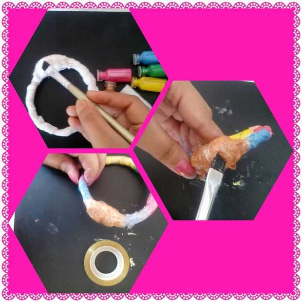 Ha pintar la envoltura de algodón con los colores de nuestra elección y dejar que se seque para en algún momento. Entonces tenemos que envolver el marco pintado con cellotape.