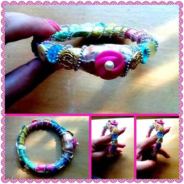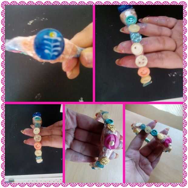 Tenemos que pegar un botón grande en el centro y fijar una perla en el botón con el pegamento y Ciña la cadena alrededor de cada botón. Y LA PULSERA ESTÁ LISTA PARA USAR!!!