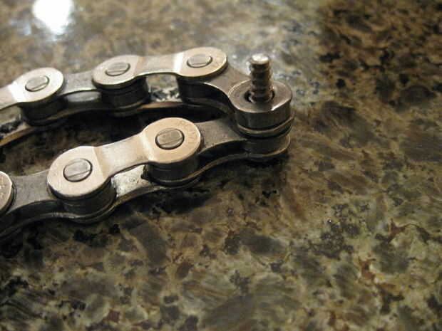 Necesita el tornillo de ajuste a través de los extremos de la cadena de la bicicleta. Si necesario, sierra para metales del extremo del tornillo por lo que no es tan largo. A menos que usted está usando una tuerca desea Sierra para metales del extremo.