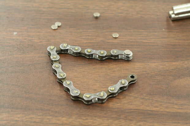 Si quieres un soporte magnético parte, coloque los imanes con JB Weld. Otros pegamentos pueden trabajar así. Poner una pequeña gota de pegamento en cada perno como se muestra en el cuadro 1. Recuerde que los imanes van a saltar de los dedos y se adhieren a la cadena... Estar preparados para ello o se mancha el pegamento alrededor y hacer un lío.
