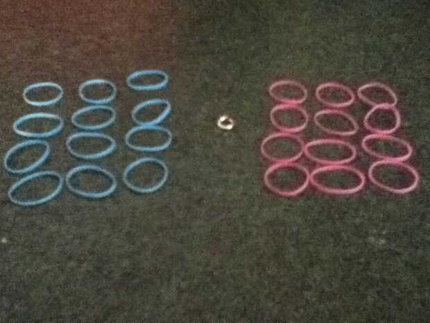 Bajar la cantidad de bandas de goma (yo 24, mi muñeca es de 6"). Luego tome el anillo del salto y una banda de caucho, ponerlo en el anillo del salto. Doblar por la mitad y hacerlo de nuevo. Seguir haciendo hasta que sólo el tamaño correcto.