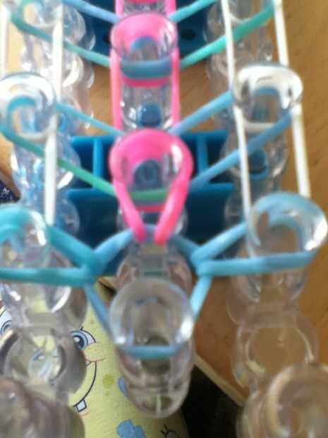 esto es una pulsera de nivel intermediaria, se puede hacer muy fácilmente.Fuentes: 3 colores de bandas en telar, telar del arco iris y un gancho.Paso 1: Empezar por colocar dos bandas blancas en forma de 'v' en el inicio del telar.Paso 2: El lugar un