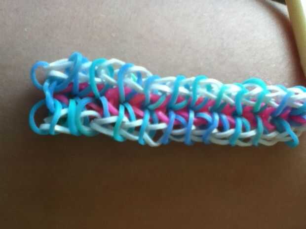 esto es una pulsera de nivel intermediaria, se puede hacer muy fácilmente.Fuentes: 3 colores de bandas en telar, telar del arco iris y un gancho.Paso 1: Empezar por colocar dos bandas blancas en forma de 'v' en el inicio del telar.Paso 2: El lugar un