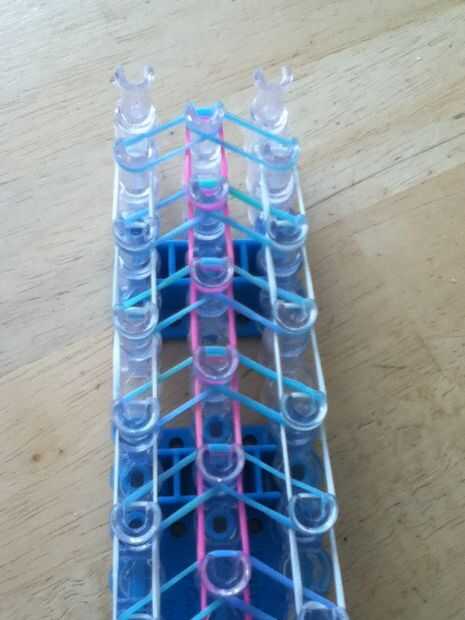 esto es una pulsera de nivel intermediaria, se puede hacer muy fácilmente.Fuentes: 3 colores de bandas en telar, telar del arco iris y un gancho.Paso 1: Empezar por colocar dos bandas blancas en forma de 'v' en el inicio del telar.Paso 2: El lugar un