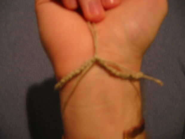 Esta parte es un poco torpe, puede que necesite un amigo para ayudar a sostener a todo. Coloque la pulsera en la muñeca. Poner el lazo en el extremo del brazalete a través del bucle al principio (uno que acaba de hacer). Ajuste del bucle al principio (rojo en las imágenes). Ayuda a mantenerla como en la segunda foto (la parte que mantengo corresponde al verde en las fotos).
