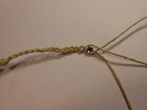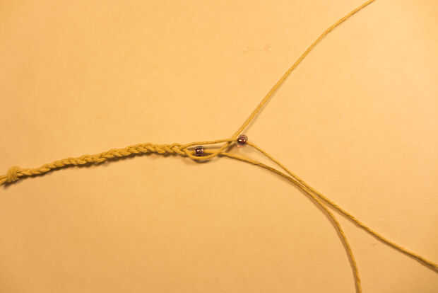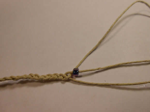 Un grano en la cadena media de la cadena. Luego poner lo dos filamento sobre el soporte del medio como una trenza normal. Coloque otra capa y repetir.