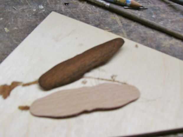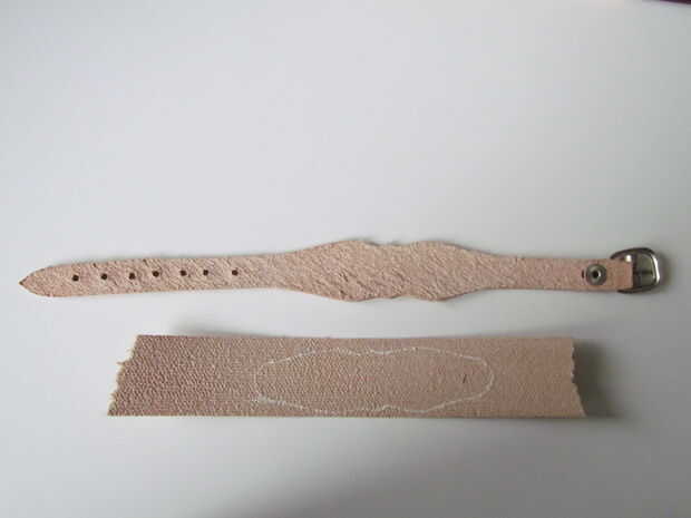 Transferir el contorno de la pulsera (tomar las espaldas) en la madera para chapa y corte cuidadosamente con una cuchilla. Deben lijar los bordes. Entonces puede manchar la chapa en el color que desee. Me gusta la madera oscura.