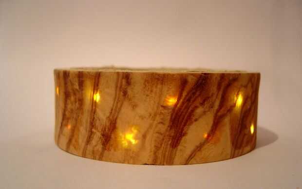 La pulsera tiene una base de madera (madera contrachapada, específicamente), un chapeado exterior, un canal para una LED circuito y difusor de la resina y una cubierta de cuero forro/batería.