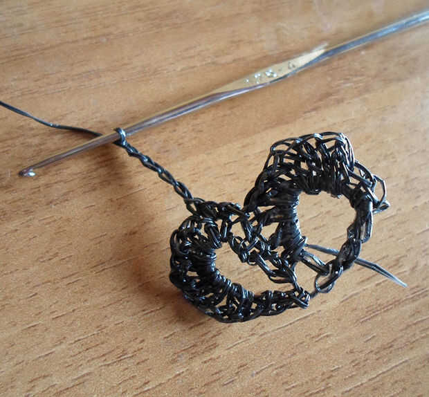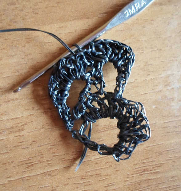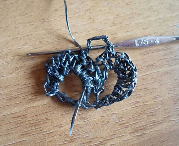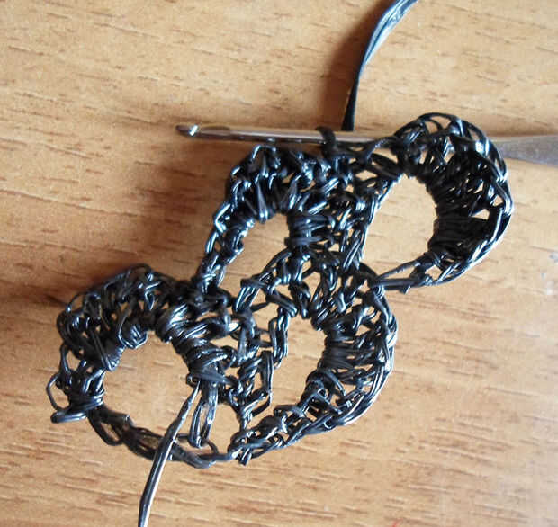 Hacer un sc, un hdc, 5 cc, un hdc y una sc.