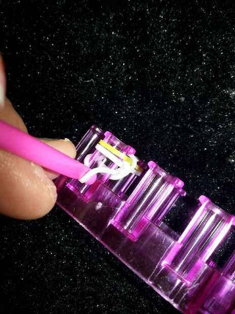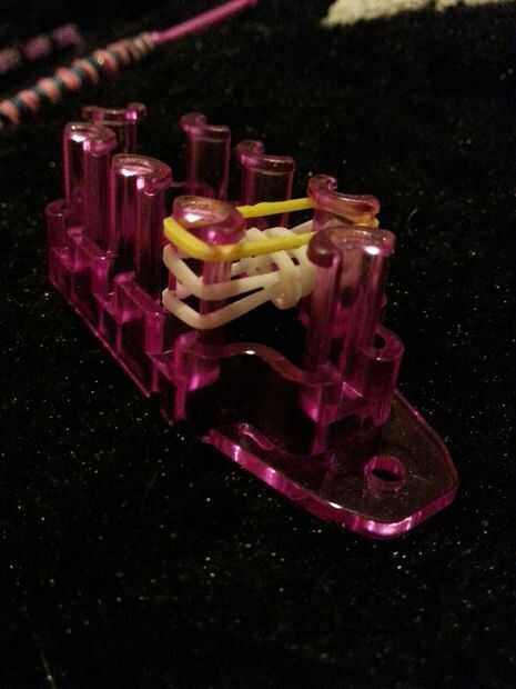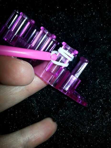 Twist una banda una vez y que en su telar cola de monstruo. (o puede utilizar los dedos para ello sólo requiere dos clavijas). luego añadir dos más como en la foto. entonces con tu gancho, agarrar la banda inferior (uno trenzado) y llevarlo hacia arriba y sobre las otras bandas y la clavija. lo mismo que las prohibiciones de Anne en el otro lado. agregar otra banda y tomar la banda inferior y llevarla hasta en las mejores dos bandas y en la clavija. hacer lo mismo con la misma banda en el otro lado. seguir haciendo esto hasta que haya alcanzado la longitud deseada.