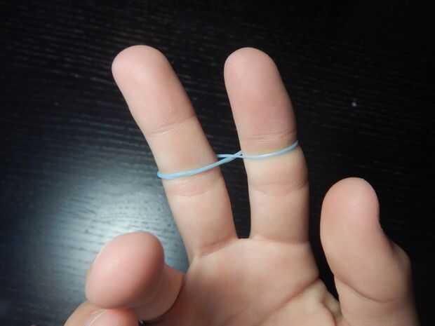 En primer lugar, obtener su puntero de dedo y medio y obtener una banda de caucho y la goma en un signo de infinito (8) y ponerlo en los dedos.