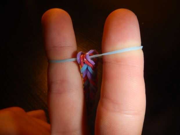 Repita este proceso hasta que estés satisfecho con la longitud de la pulsera. Cuando estás bien con la longitud, en vez de poner otra banda de goma, enganche la parte inferior uno sobre la parte superior, que se traduce en sólo 1 banda de goma en los dedos, como se muestra en la segunda foto.