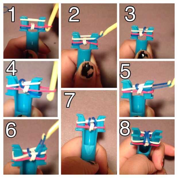 1) usando la parte posterior de su gancho, tire la segunda banda. (En este caso mi banda es de color rosa)