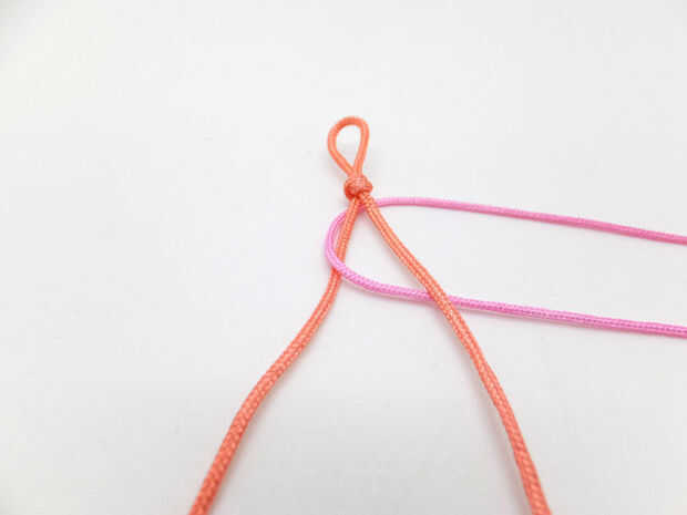 Paso 3: Tome la izquierda rosa cuerda que anuda y tejer en la hebra izquierda del cable naranja y luego en la cuerda derecha naranja.