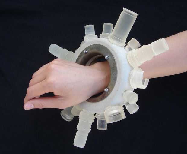 La porción de níquel de la pulsera fue hecha de la hoja del níquel calibre 22, que fue grabado al agua fuerte con cloruro férrico y PnP azul como una resistencia (que un patrón impreso láser, y el calor se transfiere a la hoja de metal). La hoja del níquel fue puesta en una prensa hidráulica con una forma hecha de acrílico. Después de que la hoja se formó, fue corte y atornillado sobre la pieza de hormigón. Las piezas del microscopio de resina se atornillan en la pulsera y el níquel hoja oculta todas las tapas de tornillo.