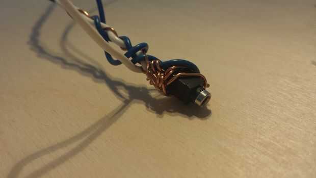 4. Si usted no parece un buen método con solo envolver, puede también cuidadosamente los extremos del cable de la bobina a y utilice un adhesivo o una pieza de joyería (como una cinta de sujeción) para conectar al jack.