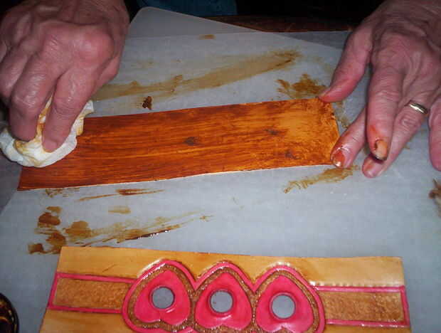 Aplicar la pasta tan antigua en la pulsera con la piel de oveja o un paño suave. También la parte de atrás de la otra pieza de cuero de color. Limpie cualquier exceso de pasta con un paño húmedo. Después de 5 minutos puede pulir la pulsera con un paño suave y hará más brillante.