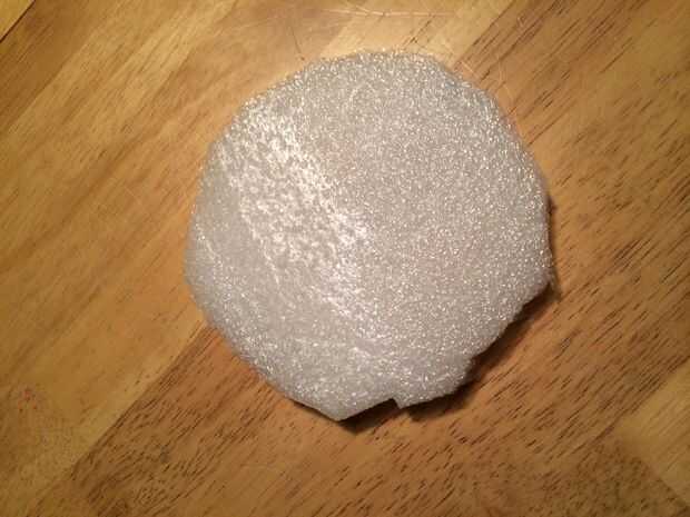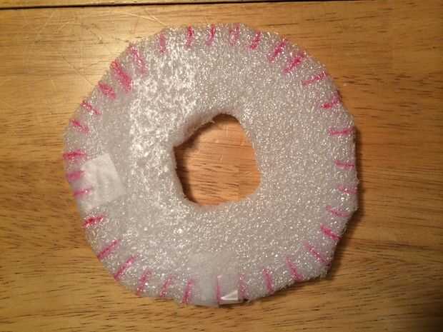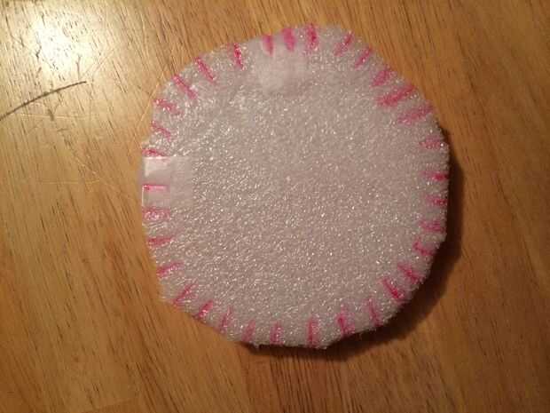 Cortar un círculo de la espuma (o cartulina) con un diámetro de aproximadamente 5 pulgadas. Luego cortan 33 pequeños cortes desde el perímetro del círculo alrededor de una media pulgada. Luego corte un pequeño agujero en el centro de la rueda con un diámetro de aproximadamente una pulgada.