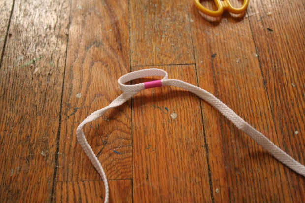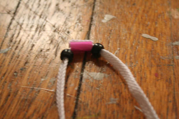 Ahora, sigamos haciendo la pulsera! En primer lugar, tome un pedazo de paja y rosca en un extremo de los cordones de los zapatos. Empujarlo hacia arriba hasta aproximadamente la mitad. Ahora, agarra el otro extremo de los cordones de los zapatos y empujar hacia atrás a través de la paja para crear un bucle. A partir de ahí, estire ambos extremos hasta que la paja se encuentra en el centro con un pequeño bucle por encima de él.