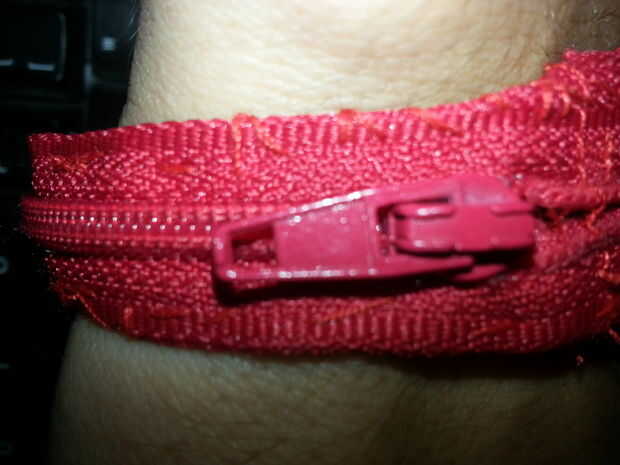 Tuve unas cremalleras colocación alrededor así que decidí hacer una pulsera de cremallera con uno de ellos. Lo hice para que puedo deslizarla dentro y fuera de mi muñeca. Puede coser a mano o utilizar una máquina. Este fue un proyecto rápido para hacer y no requiere una gran cantidad de herramientas o suministros. Abra la cremallera para darle una apertura en la pulsera. Yo a mano stiched mina.