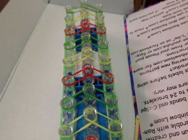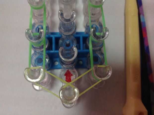 1) Coloque dos gomas en el nivel más bajo del telar donde la flecha es no mirando hacia usted (antes izquierda-derecha)