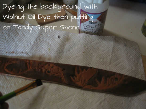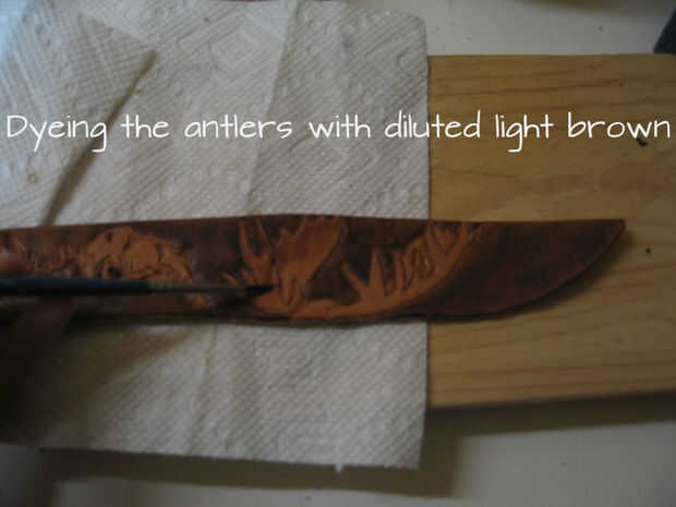 Para los colores que tengo, el fondo es Fiebings tinte de aceite de nuez, y en primer lugar, teñido el fondo. Lo hice con un pincel.