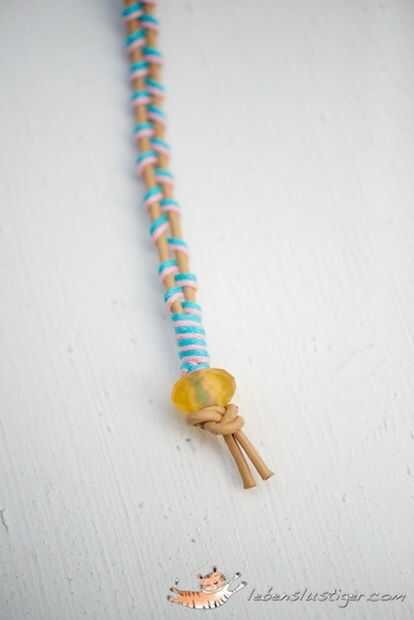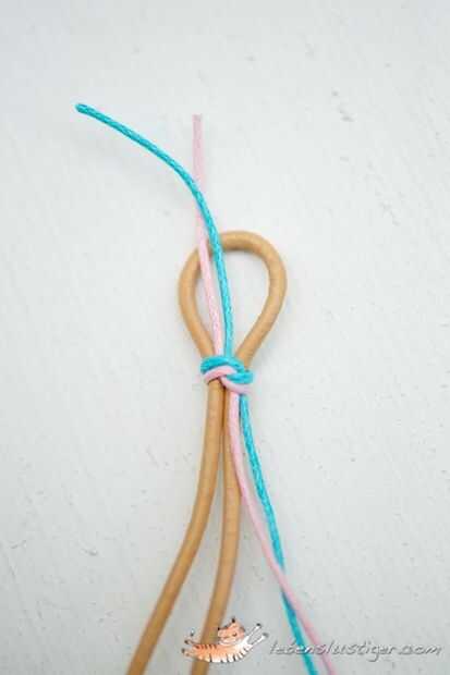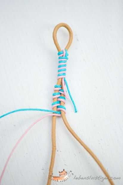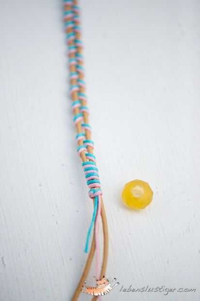 Ahora empezar a tejer en un patrón de figura de 8 alrededor de sus dos cuerdas de cuero. Dejar unas pocas pulgadas del extremo. Otra vez Envuelva firmemente un par de veces y sujételo con un nudo. Coloque una gota de pegamento sobre el nudo y cortar los extremos de la cadena.