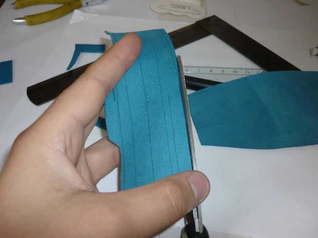 El cuero era alrededor de 0,03 pulgadas de espesor, así que utiliza tijeras para cortarlo. Ahora cuando cortar cueros más gruesos, utilizar un cuchillo y una regla, pero para piezas pequeñas, creo que tijeras son más precisas.
