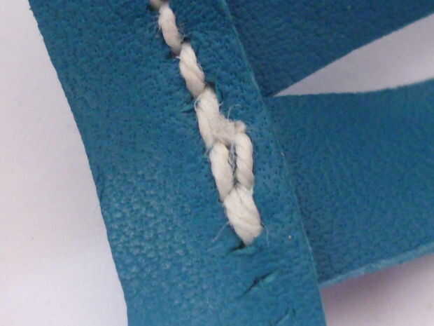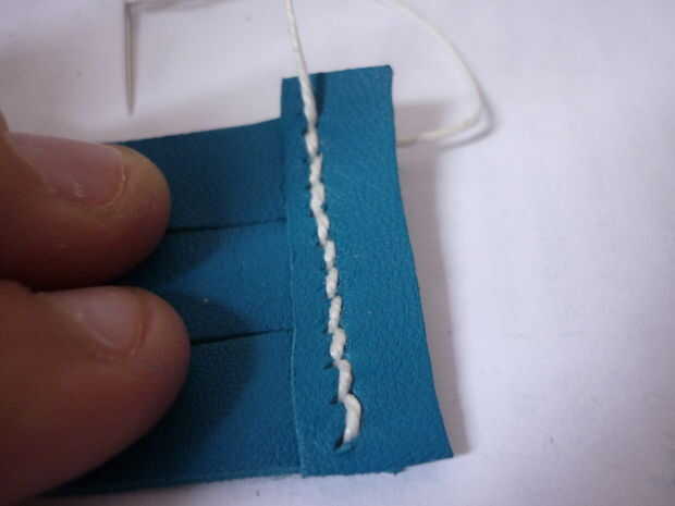 Para eso, se necesitan dos agujas, una en cada extremo del hilo. Pase el hilo en el primer agujero. Usted tiene ahora una aguja en cada lado de las piezas. Pase la primera aguja en el agujero siguiente. Luego, pase la segunda aguja en la misma bodega, pero obviamente en la dirección opuesta y apretar lentamente a ambos lados de la rosca. Eso es todo! Sólo tienes que hacer lo mismo con todos los agujeros. Para tener un buen punto, elegir un lado y comience siempre tuyo puntos con la aguja de este lado; por ejemplo siempre comienzan con la aguja de la izquierda. Tenga cuidado no pase la segunda aguja en el hilo de la primera aguja, lo hice un par de veces y es realmente complicado para volver.