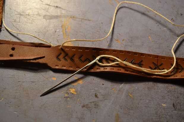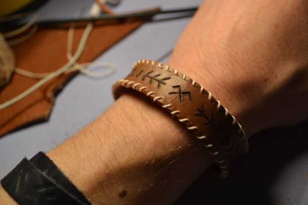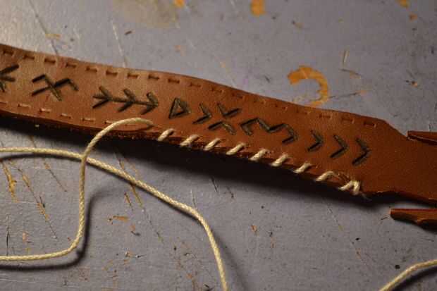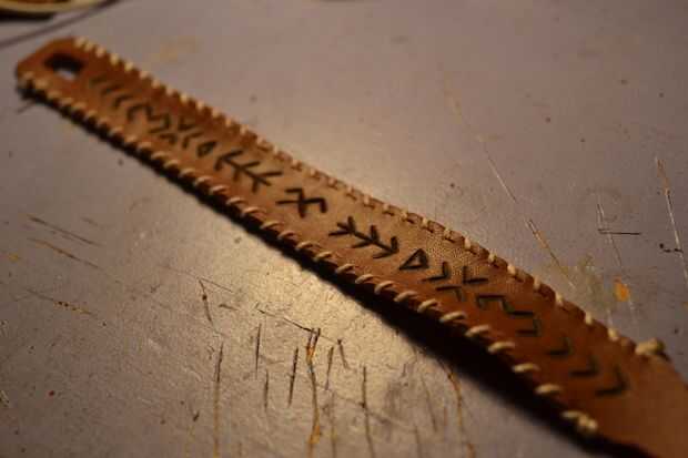 Cuando los símbolos fueron quemados en la piel, usé un simple hilo a coser alrededor de los bordes de la braclet.
