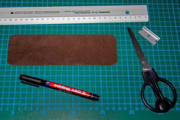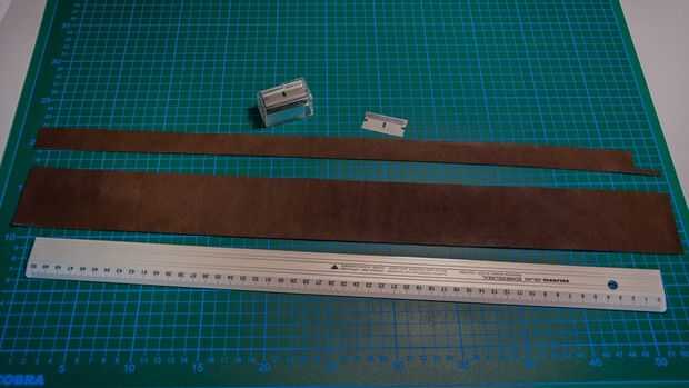 Agarra una regla de corte de filo de acero que es siempre posible, lo que significa en el mejor de los casos es más largo que la pieza de cuero que usted desea cortar youself. Mina no era suficientemente bastante largo, así que tuve que volver a colocar entre mis gobernantes. Tomé mucha atención cuando volviéndolo por lo que he podido conseguir un borde recto, muy agradable. Utilicé mi regla y realmente, realmente sostenido sola cuchilla hoja de afeitar de seguridad (en adelante: cuchillas de afeitar) para mí obtener un borde recto.