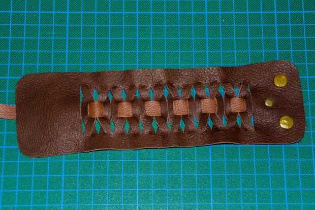 Nada muy complicado, simplemente usar un remache y remache setters para atar la tira de tejido a la pulsera. Nota que desea adjuntar en la parte inferior de la pulsera con la parte superior de la tira de tejido contra el lado de la piel de la pulsera. Sólo asegúrese de que cuando de la armadura, la parte superior de la tira de tejido es realmente hasta.