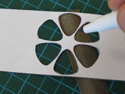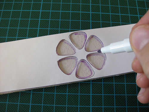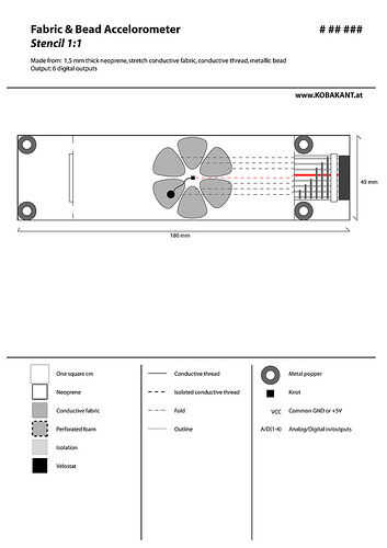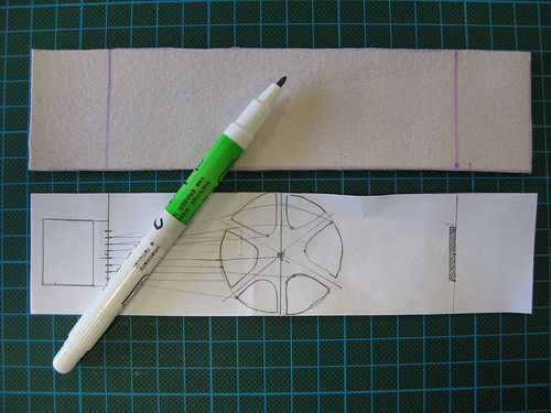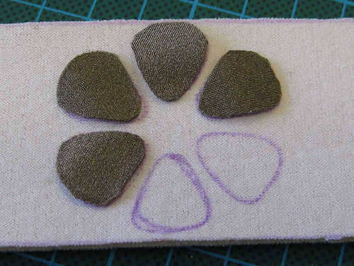 Imprimir la plantilla (ver ilustración) y del rastro a una pieza de neopreno. Trace el patrón de pétalo de flor para estirar la tela conductora que tiene fusible entretela adherido a un lado. Corte las piezas de tela conductora y neopreno. Perforar los poppers en el neopreno, como se muestra en la ilustración. Asegúrese de que los lados activos se enfrentan a la manera derecha. También puede usar Velcro como un sujetador.