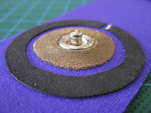 Actualización: Usando un alambre envuelto alrededor de la máquina central para hacer contacto con el anillo resistente (potenciómetro circular). Por desgracia (aunque demasiado cool) la tela de Eexonyx es sensible a la presión, por lo tanto su resistencia varía también en la presión aplicada, no sólo en la posición de contacto.