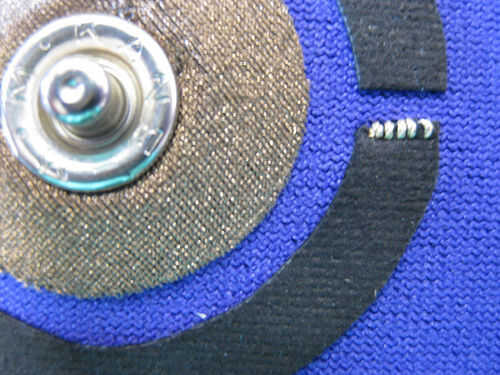 hace un brazalete decorado con seis pétalos de tela conductora y un hilo de bolita con una tira de metal en el extremo, para una detección de inclinación simple de seis puntos. También está diseñado para que el grano del metal hará contacto con los d