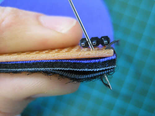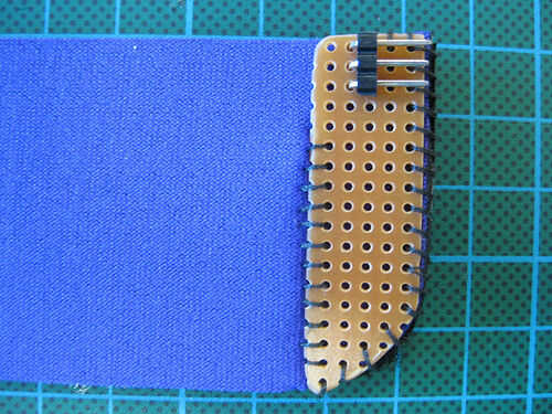 Coser el círculo de tela conductora el agujero perfboard más lejos izquierda conectado a un jefe masculino, pasando por alto la resistencia de pull-up.