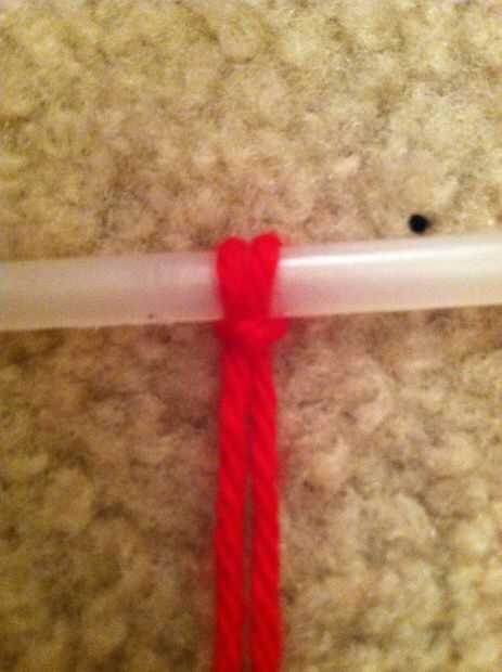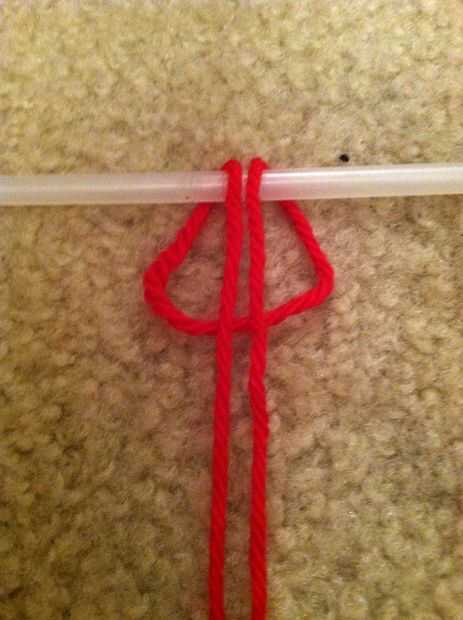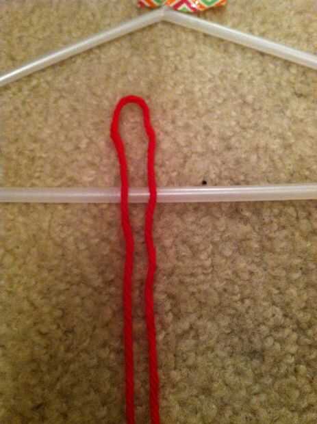 La hebra de hilo y dóblalo por la mitad y colóquela encima de la parte inferior de la suspensión. Lazo bajo la percha y luego traer las dos piezas de hilo en el lazo y tire