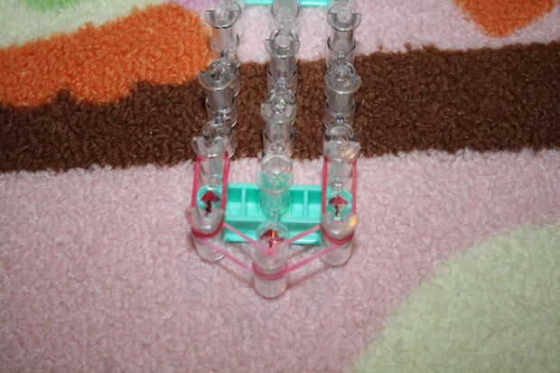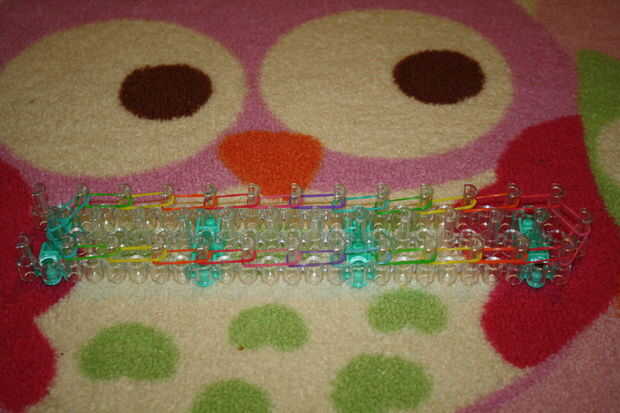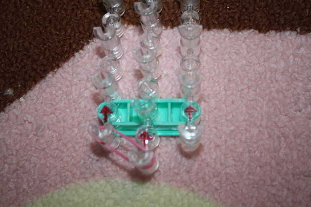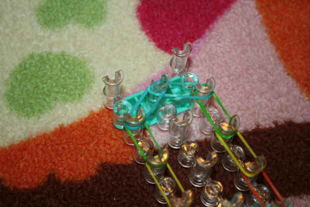 Paso 1: Obtener las herramientas Necesita su telar del arco iris, 2 colores de bandas de goma, un clip de c y un gancho.Paso 2: a partir de Una banda de goma en los dos pasadores de la torcedura. Y hacerlo otra vez con otra banda elástica.Paso 3:Gire