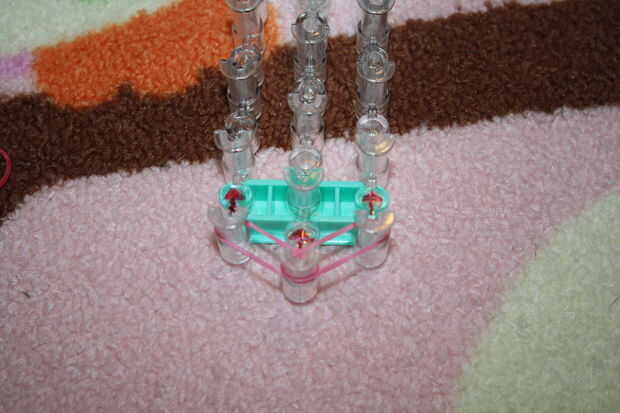 Asegúrese de que las flechas están apuntando lejos de usted. Traer el primer color del centro en la clavija correcta 1. Luego traer otra banda del mismo color desde el centro a la clavija 1 º izquierda. Tomar el siguiente color y ponerlo en la parte superior verticalmente sobre el primer color en ambos lados. Repetir este proceso hasta el final. Al final, traen el último color en ambos lados en el centro.