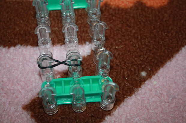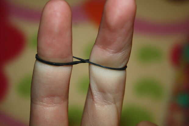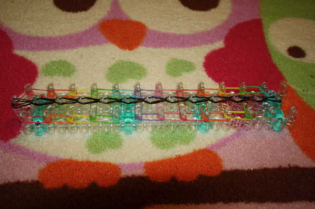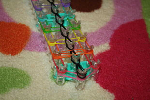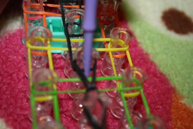 Paso 1: Obtener las herramientas Necesita su telar del arco iris, 2 colores de bandas de goma, un clip de c y un gancho.Paso 2: a partir de Una banda de goma en los dos pasadores de la torcedura. Y hacerlo otra vez con otra banda elástica.Paso 3:Gire