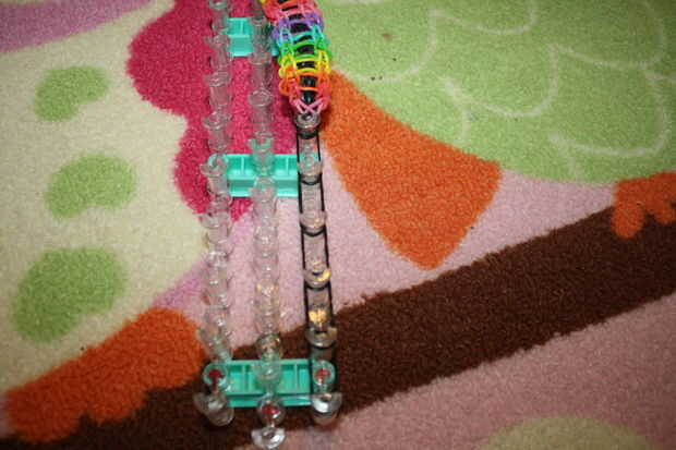 Paso 1: Obtener las herramientas Necesita su telar del arco iris, 2 colores de bandas de goma, un clip de c y un gancho.Paso 2: a partir de Una banda de goma en los dos pasadores de la torcedura. Y hacerlo otra vez con otra banda elástica.Paso 3:Gire