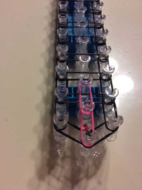 a continuación coloque su banda de color medio todo hacia adelante las clavijas del centro. Parada donde dio vuelta a la mitad