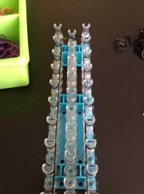 En primer lugar escoger tres colores y a la clavija central. Sacó su color exterior a la clavija de la izquierda y derecha. Ahora con el mismo color, ir hacia arriba en el telar.
