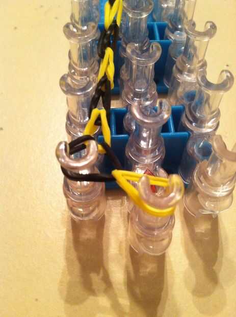 primero lo primero, necesita crear el perímetro de la pulsera, coloque su primera banda de cualquier color y colocar desde el centro a la izquierda y desde el centro a la derecha, así como en la imagen. Luego tomar cualquier banda del color de su ele